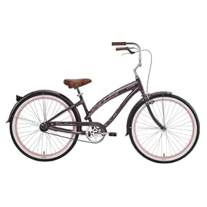 The Nirve® Cherry Blossom ladies' bike is a cute cruiser with a sweet attitude. It's built around an alloy frame with the unique Cherry Blossom graphics package, and it is well equipped with a front hand brake, rear coaster brake, and ergonomic handlebars. Full-sized fenders and a chain cover keep you clean as you ride down the boardwalk.